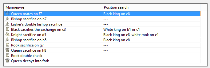 Die Suchmaske von ChessBase 16 ermöglicht die gezielte Suche nach bestimmten Manövern. Je nach Eröffnungsauswahl und denen daraus resultierenden Stellungskonstellationen wiederholen sich immer wieder bestimmte Manöver. Für den aktiven Turnierspieler ist es wichtig diese Standardmanöver zu kennen und zu verstehen. Mit Hilfe der Suchmaske ist es mit geringem Aufwand möglich, passende Vergleichspartien aus jeder beliebigen, auf der Festplatte gespeicherten Datenbank herauszufiltern.