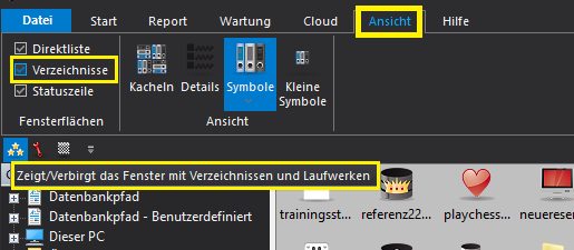 Lösung: Im Datenbankfenster, also dem Startbildschirm, muß die Dateiansicht mit den Verzeichnissen eingestellt werden. Diese Ansicht schalten Sie unter dem Menüpunkt Ansicht – Verzeichnisse ein.