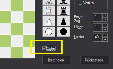 Aktiviert man die Option „Opfer“ mit einem Häkchen, sucht das Programm automatisch alle Partien in der Datenbank, in denen kurzfristig Material geopfert wurde.