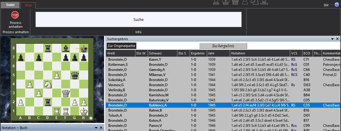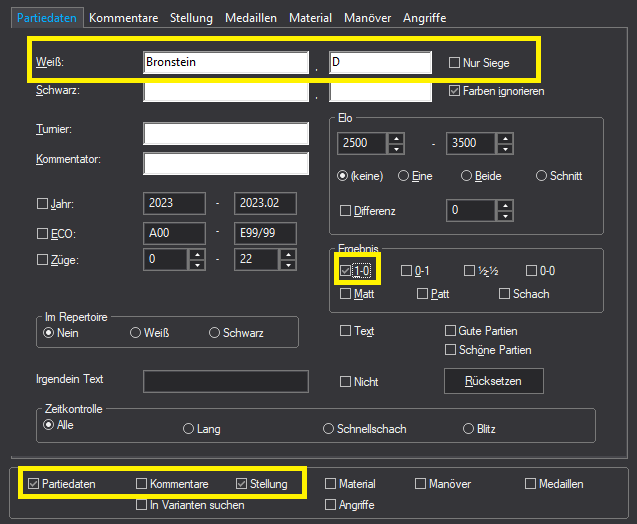 Dazu ein Beispiel: die Suche nach Opfern wurde mit der Suche nach Partien des legendären Großmeisters David Bronstein (einem der begnadesten Taktiker der Schachgeschichte ) unter dem Abschnitt Partiedaten in der Suchmaske verknüpft.