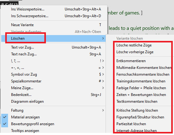 Das Programm bietet Funktionen um gezielt bestimmte Kommentierungen aus einer Partie entfernen, ohne erwünschte Kommentare mit zu löschen? Wie kann man diese Elemente aus der Notation löschen ohne daß die restliche Kommentierung verloren geht?