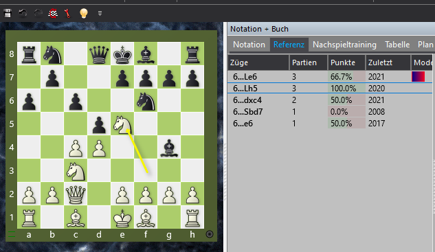 Mit einem Klick auf den Reiter Referenz im Brettfenster startet in ChessBase die Eröffnungsreferenz.