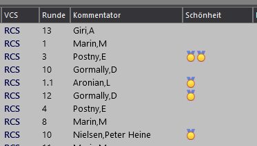 Kommentierte Partien werden in Partienlisten unter anderem mit dem Buchstaben „ C “ gekennzeichnet.